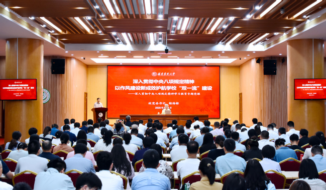 7月1日上午,校党委书记赖海榕以“深入贯彻中央八项规定精神 以作风建设新成效护航学校‘双一流’建设”为题,在常盛会议中心讲授深入贯彻中央八项规定精神学习教育专题党课,深入阐释中央八项规定及其实施细则精神内涵,传承弘扬习近平总书记23次关心学校事业发展的重要理念和重大实践,传达学习省委书记周祖翼、省长赵龙在深入贯彻中央八项规定精神学习教育专题党课上的讲话精神,强调要深入学习贯彻习近平总书记重要讲话重要指示批示精神,从深刻领悟“两个确立”的决定性意义、坚决做到“两个维护”的政治高度,切实把思想和行动统一到党中央决策部署和省委工作要求上。校党委副书记曾华平主持,全体在家校领导参加。