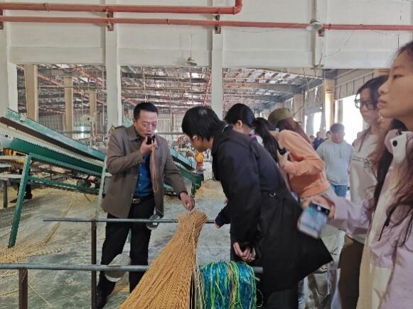 在建瓯市林业局竹业股与产业股的协调下,同学们先后调查福建省建瓯水西国有林场毛竹林丰产林,走访福建大庄竹业科技有限公司与联华七贡笋业有限公司。在水西国有林场,同学们学习毛竹年龄判别和大小年竹判定,实地调查竹业一产的竹林年龄结构和采伐作业方式等基本竹林培育技能;在竹材加工和竹笋加工企业,大庄竹业黄主任引导同学们深入车间了解竹刨切材、防火材等产品加工流程;在联华七贡笋业,同学们了解水煮笋精深加工全链条。竹材加工和竹笋加工依赖于林业培育,同学们在实践中切身感受竹产业链中“资源培育—加工利用—市场销售”的紧密衔接,深刻理解“以竹代塑”国家战略与“双碳”目标下竹产业在推动乡村振兴中的重要作用。