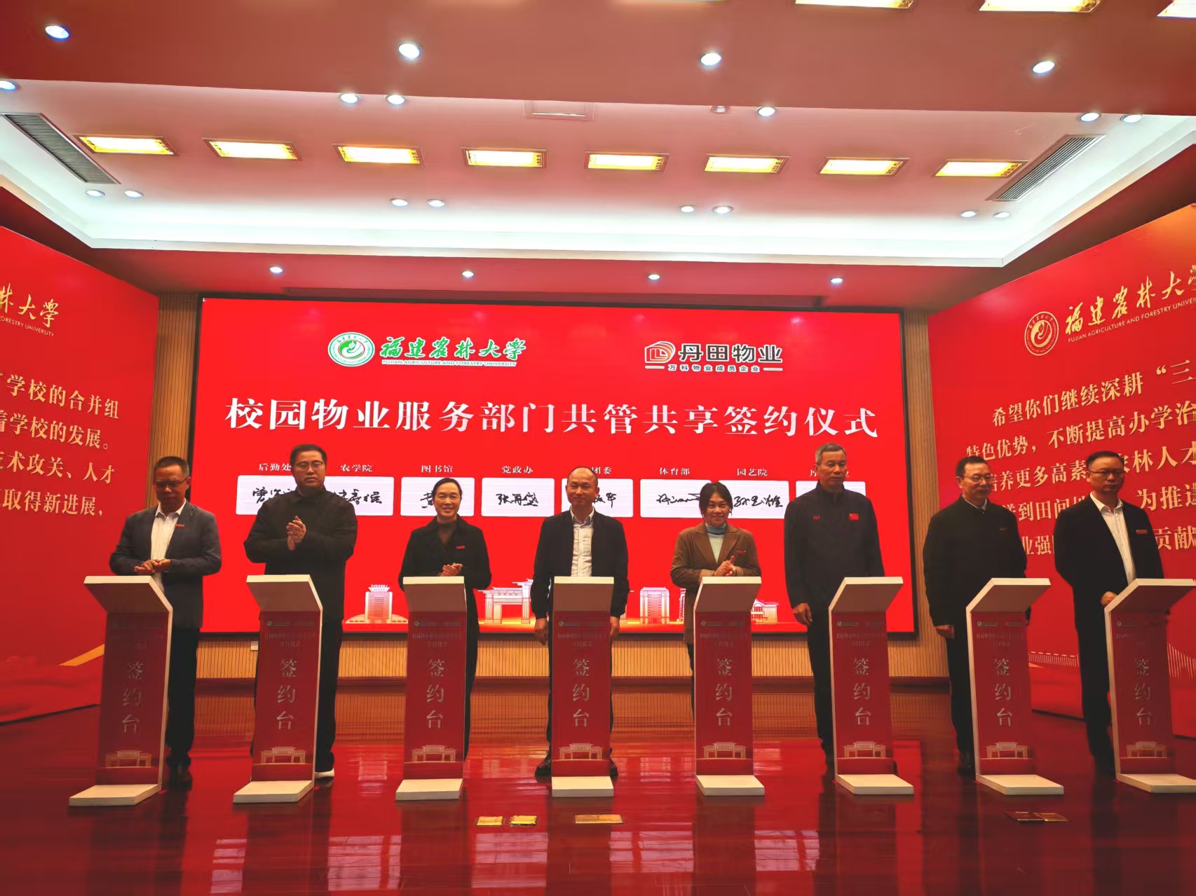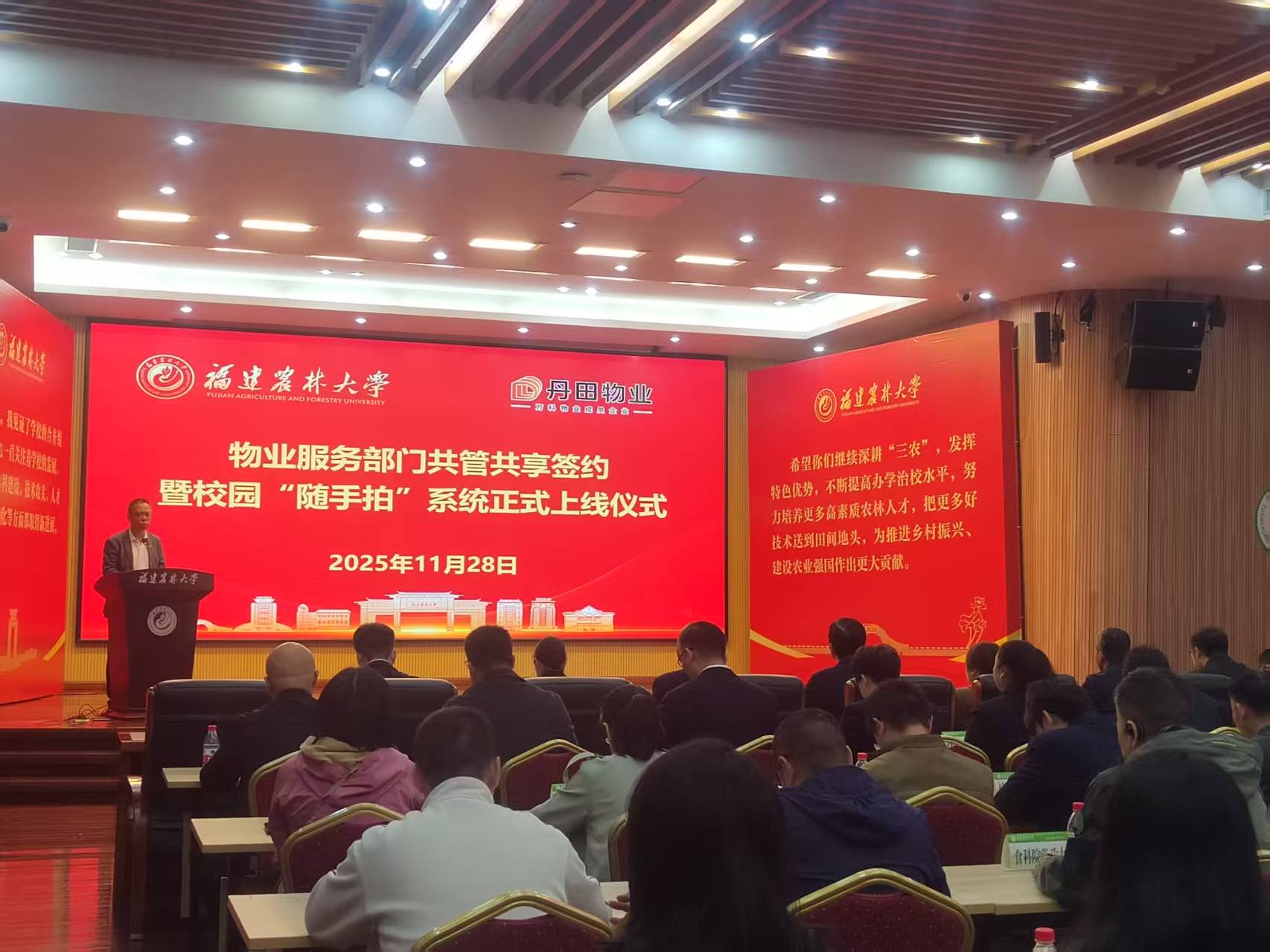 11月28日,后勤管理处在福州仓山校区常盛会议中心举行物业服务部门共管共享签约暨校园“随手拍”系统正式上线仪式。副校长林庆藩、珠海市丹田物业管理股份有限公司校园事业部总经理田俊华出席仪式,校党政办、校团委、图书馆、公共体育教学部、农学院、园艺学院等单位领导及相关部门综合科、仓山校区各学院党政办负责人、后勤管理处全体处科级干部及相关科室工作人员、丹田物业工作人员等近百人参加活动。仪式活动由后勤管理处处长曾海滨主持。