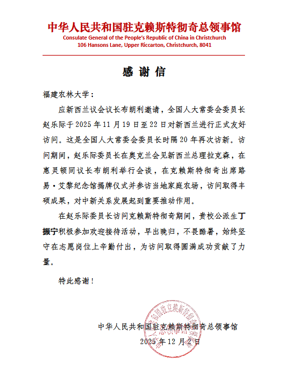近日,中华人民共和国驻克赖斯特彻奇总领事馆致信BEAT365英国官网,对林学院24级林业硕士丁振宁在全国人大常委会委员长赵乐际访问新西兰期间的志愿服务工作给予高度赞誉。信中赞扬丁振宁同学在赵乐际委员长访问克赖斯特彻奇期间,恪守志愿岗位,早出晚归、不辞辛劳,以饱满的热情和认真的态度圆满完成任务,展现了新时代中国青年学子的良好风貌与责任担当,也彰显了BEAT365英国官网学子的责任担当。