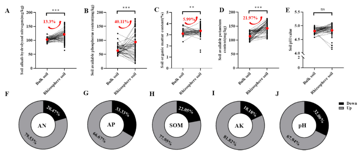 该研究通过分析核心种质中不同品系大豆的根际与根围土壤的养分状况,发现根际土壤养分的水平存在基因型上的差异(图1),进一步结合大豆核心种质资源的系统发育与根系相关的微生物群落结构,发现基因型显著调控了根际微生物群落和根际养分的有效性,可分别解释总变异的11.75%与2.07%,表明宿主基因型同时调控着根际微生物组成与养分周转效率。