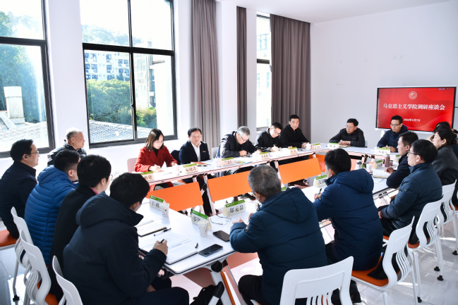 马克思主义学院领导班子成员和全体思政课教师参加集体备课会,党政办、组织部、宣传部、教工部、教务处、研究生院、金山学院负责人、马克思主义学院领导和教学骨干参加调研座谈。