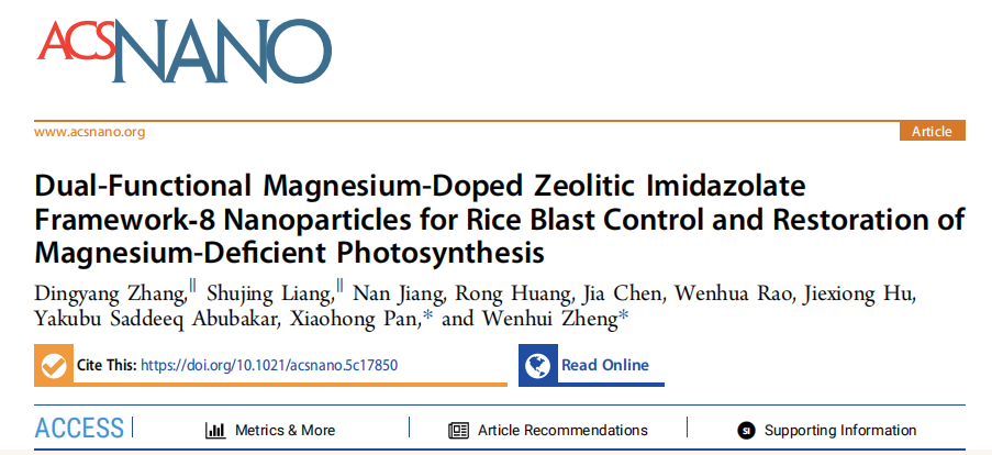 2026年1月7日,我院郑文辉教授联合潘晓鸿教授团队在国际顶级期刊ACS NANO(中科院一区TOP,IF=16.1)在线发表了题为“Dual-Functional Magnesium-Doped Zeolitic Imidazolate Framework-8 Nanoparticles for Rice Blast Control and Restoration of Magnesium-Deficient Photosynthesis”(用于稻瘟病防治和恢复镁缺乏光合作用的双功能镁掺杂ZIF-8纳米颗粒)的研究论文。该研究发现镁掺杂ZIF-8纳米颗粒(Mg-ZIF-8)可通过诱导稻瘟病菌ROS介导的细胞损伤抑制其附着胞介导的侵染,同时补充并维持水稻镁稳态以恢复缺镁导致的光合作用缺陷,从而实现“抗病防控+光合修复”的双功能一体化策略。