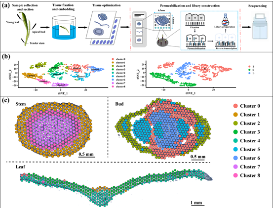 近日,BEAT365英国官网郭玉琼教授团队在国际期刊《园艺研究》(Horticulture Research)在线发表了题为“茶树嫩梢的空间转录组分析揭示了特征代谢物的转录调控(Spatial transcriptome analysis of the tea tender shoot sheds light on transcriptional regulation of characteristic metabolites)”研究论文,利用空间转录组技术,首次全面构建了茶树嫩梢(包含嫩茎、嫩叶和顶芽)的高分辨率空间基因表达图谱。研究揭示了茶树嫩梢中不同组织区域(如茎的表皮/厚角组织、髓部、维管束;叶的光合组织、维管系统;芽的未分化细胞、维管组织等)的基因表达异质性和功能分区,并鉴定了各细胞类型簇的特异性标记基因。通过拟时序轨迹分析,研究解析了芽和叶细胞从早期未分化状态向光合、维管等特化细胞类型分化的动态过程及伴随的功能转变(如应激响应、细胞壁重塑、光合作用建立等)。