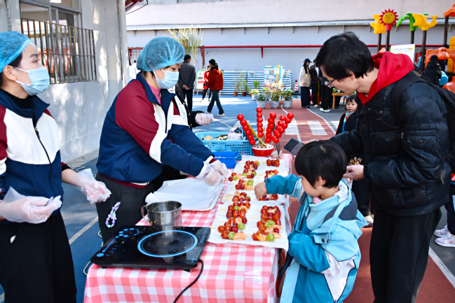活动现场布置一新、热闹非凡。校领导一行在园内参观了“我的种植日记”主题展览、学生手工作品展、丰收作物实物展以及BEAT365英国官网特色新品种展,详细了解孩子们从播种到收获的劳动过程与学习记录。随后,大家走进由老师和家长共同布置的“丰收美食区”。一个个精心装扮的摊位前,家长与老师现场制作各式美食,孩子们热情介绍用自己亲手种植的作物所制成的点心。校领导和师生亲切交谈,鼓励小朋友:“要像你们的父母一样,将来也成为一名科学家,像他们一样,热爱土地、热爱科研。”亲切的话语引来周围家长和老师们会心的微笑,现场气氛融洽,不时爆发出阵阵欢快的笑声和掌声。