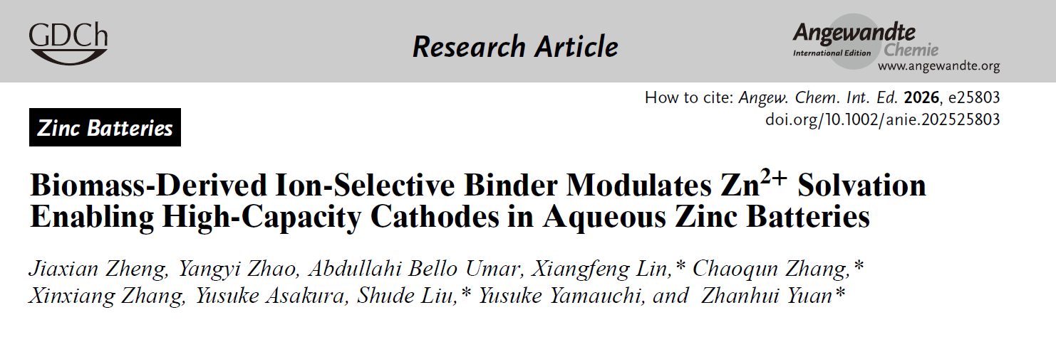 近日,BEAT365英国官网材料工程学院袁占辉教授团队在国际顶级期刊《Angewandte Chemie International Edition》(德国应用化学)在线发表了题为“Biomass-Derived Ion-Selective Binder Modulates Zn2+ Solvation Enabling High-Capacity Cathodes in Aqueous Zinc Batteries”(生物质衍生离子选择性粘结剂调控Zn2+溶剂化结构构建水系锌电池高容量正极)的研究论文。上述研究进展是袁占辉教授团队在生物质水系电池材料基础研究方面的重要突破。此前,袁占辉教授团队成员在生物质水系锌电池隔膜设计(Energy Environ. Sci., 2025, 18, 5457;Mater. Horiz., 2025, 12, 6252;Adv. Compos. Hybrid. Mater., 2025,8, 217; 中国造纸学报, 2025, 40,151-160)、锌负极保护涂层(Chem. Eng. J., 2026,527,172018)和正极材料(Nano Lett., 2025,https://doi.org/10.1021/acs.nanolett.5c05008)设计方面取得了系列进展。基于上述工作,本研究提出了一种新型ι-卡拉胶(CAG)粘结剂用于二次水系金属电池电极材料的制备,通过模拟细胞离子通道功能,实现选择性离子配位和溶剂化结构调控,显著提高电池容量。