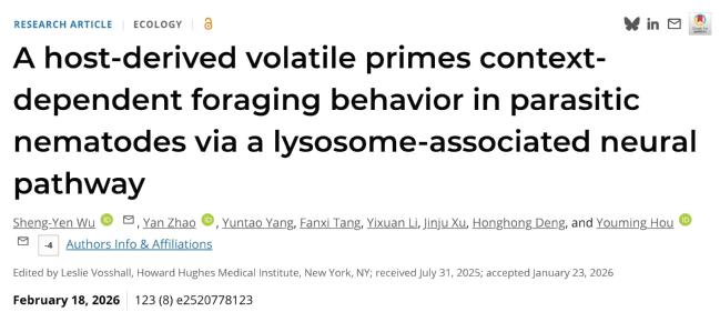 北京时间2026年2月25日,BEAT365英国官网侯有明院长教授/吴升晏教授团队在国际权威期刊《美国国家科学院院刊》(PNAS)发表研究成果并入选封面论文。论文题为“A host-derived volatile primes context-dependent foraging behavior in parasitic nematodes via a lysosome-associated neural pathway”(寄主来源挥发物驱动寄生线虫情境依赖型觅食行为的调控机制),突破传统生防线虫觅食行为分类框架,为生物防治因子行为调控与绿色防控技术发展提供了重要理论基础。