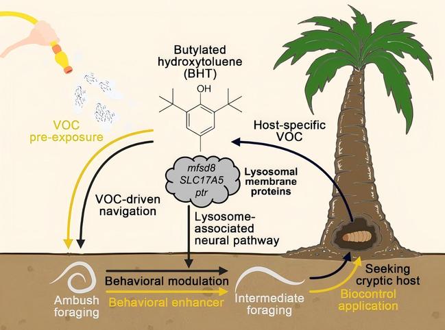 在机制层面,研究进一步从行为调控角度出发,解析了溶酶体相关神经通路在这一过程中所起的作用。结果表明,寄主挥发物信号能够通过影响线虫体内相关转运系统与代谢状态,进而改变其神经活动与行为输出。研究成功将化学信号、能量代谢与行为响应建立起关联,体现了从生态现象到生理调控的跨层级认知整合。