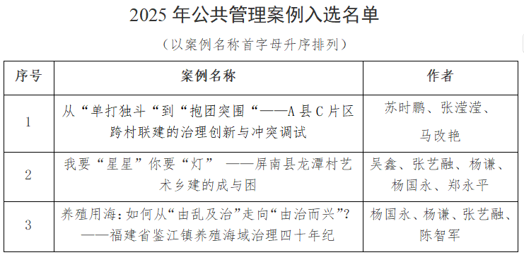 近日,2025年中国专业学位案例中心公共管理案例征集活动评选工作已完成。经过严格的文本检查、案例评审、案例会审等环节,公共管理学院3篇案例入选中国专业学位案例中心公共管理案例库。