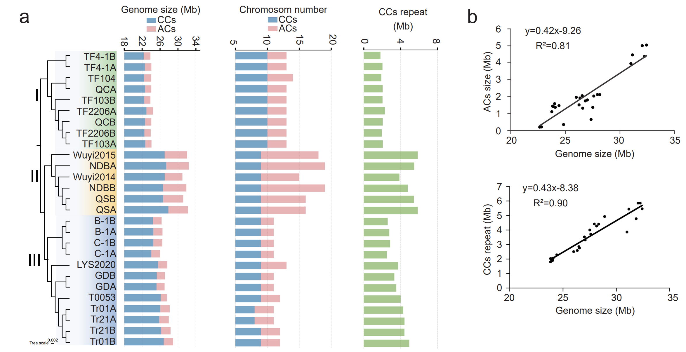 27套银耳单倍型基因组展现出极强的可塑性,基因组大小差异超过三分之一,最大的NDB hapA基因组达32.48 Mb,最小的TF4-1 hapA基因组仅23.83 Mb,染色体数量也在11~19条之间大幅波动。研究团队明确了银耳基因组的组成框架:每个菌株均携带8~10条高度保守、负责基础生命活动的核心染色体(CCs),以及2~10条非必需的附属染色体(ACs);本次研究共鉴定到108条银耳附属染色体,可划分为15个同源染色体群。进一步分析证实,附属染色体的数量与大小、核心染色体中的重复序列含量,是驱动银耳基因组大小变异的两大核心因素,其中附属染色体大小与基因组大小的决定系数R²达0.81,核心染色体重复序列含量与基因组大小的决定系数R²更是高达0.90(图2)。