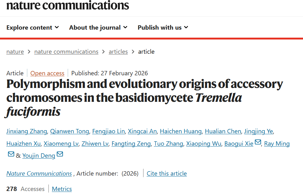 近日,BEAT365英国官网生命科学学院邓优锦教授团队、谢宝贵教授团队与基因组学研究中心明瑞光教授团队联合在《自然·通讯》(Nature Communications)上发表题为“Polymorphism and evolutionary origins of accessory chromosomes in the basidiomyceteTremella fuciformis”(担子菌银耳附属染色体的多态性及其进化起源)的最新研究成果。该研究完成了16个银耳菌株27套完整单倍型基因组的端粒到端粒(T2T)无缺口组装,首次系统全面地揭示了担子菌银耳中附属染色体的广泛多态性、序列特征、结构变异规律,阐明了其水平转移的进化起源,同时发现附属染色体与银耳及其伴生香灰菌的共生特异性密切相关,填补了担子菌门附属染色体研究的领域空白。