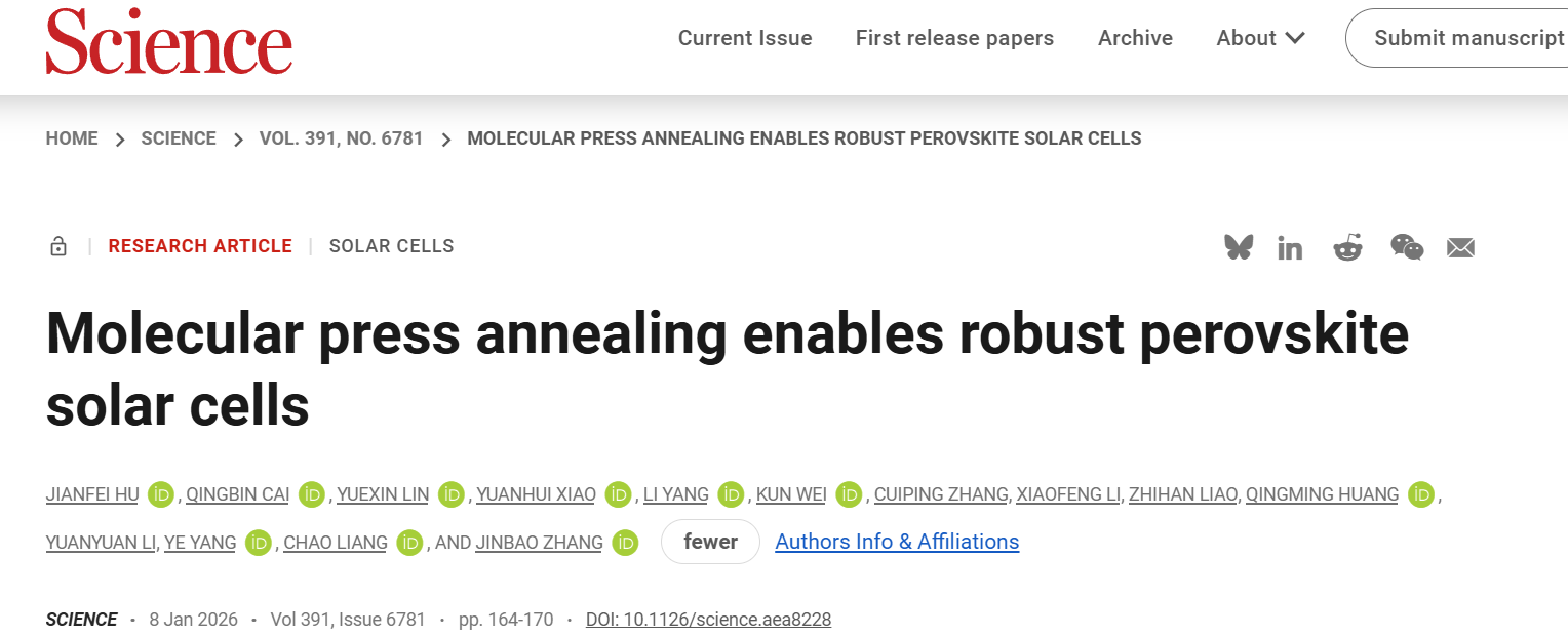 北京时间2026年1月9日,福建农林大学数字经济学院绿色光电器件与储能电池团队青年教师蔡庆斌以共同第一作者在国际顶尖学术期刊《科学》(Science)发表题为《分子压印退火实现高稳定性钙钛矿太阳能电池》“Molecular press annealing enables robust perovski...