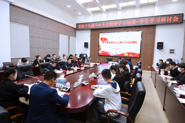 1月6日上午,受校党委书记王建南委托,校党委副书记曾华平在武夷厅主持召开学生学习党的十九届六中全会精神专题研讨会。全校35名学生代表,校党政办、学工部、校团委等相关部门负责人参加研讨会。