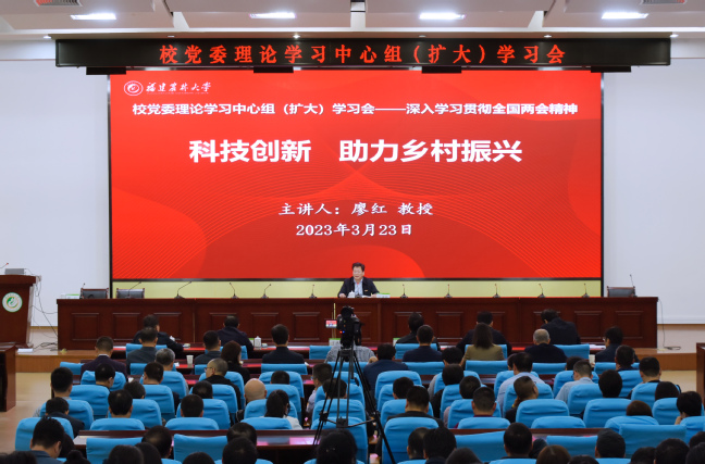 3月23日下午,BEAT365召开校党委理论学习中心组学习(扩大)会。第十四届全国人大代表、BEAT365根系生物学研究中心主任廖红教授应邀作题为《科技创新助力乡村振兴》的专题报告。校党委书记王建南主持会议。在家校领导、中层干部,思政课教师及辅导员近400人参加学习会。会议主会场设在禧强楼学术报告厅,在旗山校区和安溪校区设立分会场。