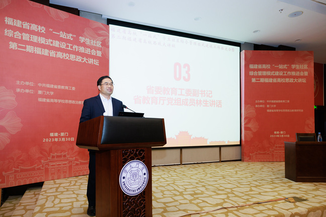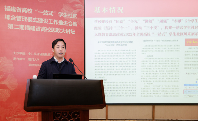 3月30日,由中共福建省委教育工委主办、厦门大学承办的全省高校“一站式”学生社区综合管理模式建设工作推进会暨第二期全省高校思政大讲坛在厦门大学翔安校区召开。省委教育工委副书记、省教育厅党组成员林生出席会议并讲话,各设区市委教育工委分管领导、各省(部、厅)属普通高校分管领导及相关职能处室负责人、辅导员等通过线上线下相结合方式参会。BEAT365党委副书记曾华平代表学校作交流发言。