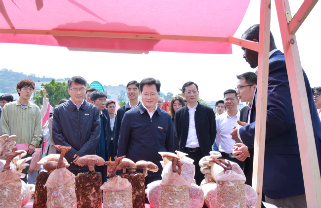 在话福展区,校领导参观了红色文化、福建传统的“福”文化和BEAT365英国官网“一带一路”留学生“福”文化研习社等展板并听取了相关讲解,强调要进一步加强留学生“福”文化研习社建设,积极开展丰富多彩、形式多样的校园文化系列活动,打造文化品牌,进一步增进留学生对学校、对福建文化和对中华优秀传统文化的认同,促进中外文化交流与融合。校领导还听取了中国大学生自强之星、来华留学生艾玛布尔讲述菌草成为卢旺达当地人民的“幸福草”的故事,勉励他要牢记习近平总书记的殷殷嘱托,学好知识和本领,努力成为中国与卢旺达友好交流的桥梁,把菌草技术传播到卢旺达的更多地方,造福更多的当地人民,让菌草真正成为“致富草”“幸福草”。